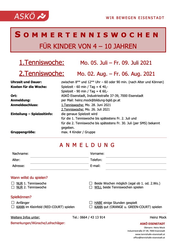In den Sommerferien veranstaltet der ASKÖ TC Eisenstadt wieder zwei Tenniswochen für Kinder im Alter von 4 - 10 Jahren.